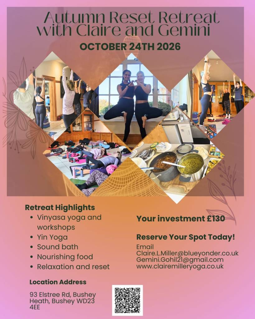 Claire Miller Yoga and Gemini – yoga retreat 26th January 2026 at the wonderful Niland centre, Bushey Heath.