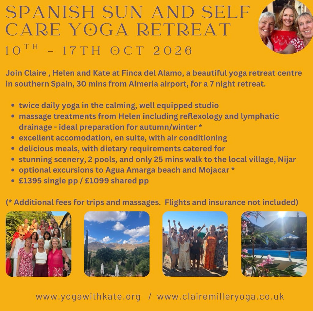 You are warmly invited to join us at the Finca del Alamo in southern Spain for a week of self care including yoga, relaxation, walking, delicious food, stunning surroundings and good company. Kate & Claire ran their first retreat here in 2024, their second in 2025 and we are thrilled to be returning in 2026. We are delighted that Helen Waring will be joining us to offer massage treatments.